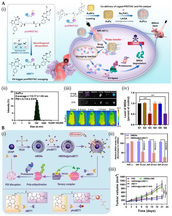 (A) (i) Photothermal-driven pro-prodrug platform of biorthogonal PROTACs uncaged through the Pd complex for co-delivery and bioorthogonal uncaging of the Pd (II)-catalyst for tumor-specific targeted treatment in breast cancer. (ii) The average size of the AuPLs is about 113.17 nm. (iii) Ex vivo fluorescence images of major organs and excised tumors and in vivo the photothermal effect of AuPLs accumulated within the tumor focal region. (iv) BRD4 protein expression levels were quantified by the software Image J. The data are presented as mean ± standard deviation. Statistical significance was determined using one- or two-way ANOVA analysis, with *** p < 0.001. Reprinted from Ref. [], Copyright (2024), with permission from Elsevier. (B) (i) Schematic illustration for designing the NIR light-activatable PROTAC nanocage and its working mode for degrading the protein of interest (POI). (ii) Western blot analysis of BRD4 expression levels after different treatments. (iii) Curves of average tumor volume changes after the administration of different formulations during the 21 days treatment period (n = 5). Reprinted with permission from Ref. []; Copyright (2023) American Chemical Society.