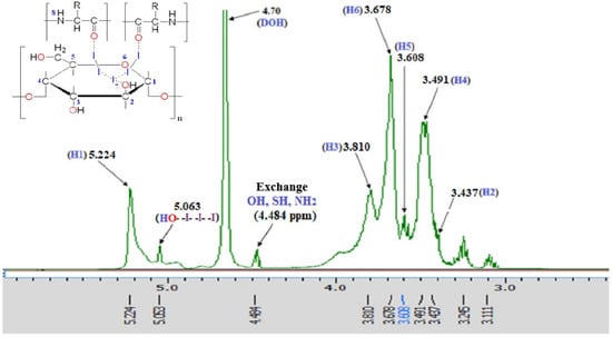 As shown in Figure 2, the 1H-NMR spectrum of the PA substance reveals characteristic signals confirming the presence of dextrin and albumin-derived fragments involved in complex formation. The resonance at 5.224 ppm corresponds to the anomeric proton (H-1) of dextrin, indicating preserved α-1,4-glycosidic linkages. Multiplets in the 3.1–3.8 ppm range reflect protons at C2–C6 of glucose units and overlapping signals from amino acid side chains.