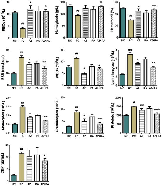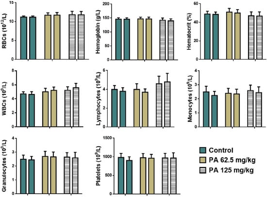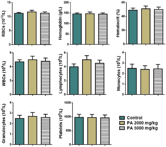 The effect of acute administration of PA at the doses of 2000 mg/kg and 5000 mg/kg on hematological parameters of mice is presented in Figure 3.