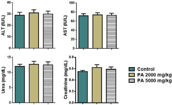Animals receiving repeated doses of PA displayed no significant alteration in plasma biochemistry markers (Figure 6). The subacute administration of PA did not affect hepatic (ALT, AST) and renal function (urea, creatinine).