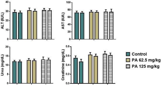Analysis of plasma biochemistry showed that the acute administration of PA did not alter hepatic (ALT, AST) and renal function (urea, creatinine) as shown in Figure 4.