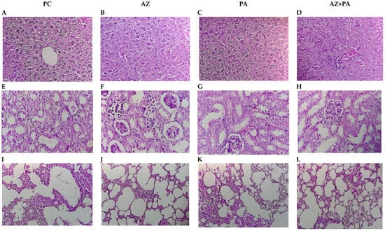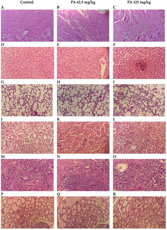 Histological examination of internal organs: heart, liver, lungs, kidney, spleen and thyroid gland of mice administered PA at doses of 62.5 and 125 mg/kg in comparison to the control group was conducted. Microscopic photographs are presented in Figure 7.