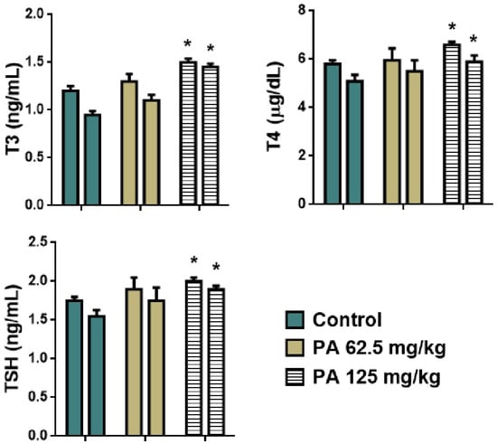 Hormones of thyroid gland of mice during the subacute toxicity study. * p < 0.001 compared to control. Note: T3—triiodothyronine, T4—thyroxine, TSH—thyroid stimulating hormone; left column—male and right column—female.