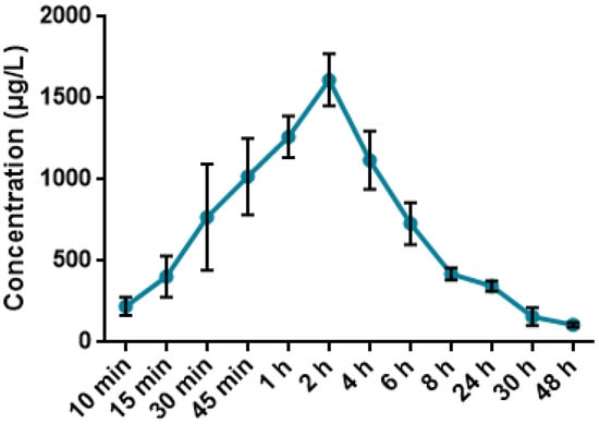 Blood collected at 10, 15, 30, 45 min and 1, 2, 4, 6, 8, 24, 30, 48 h was analyzed through ICP-MS system for determination of the quantity of iodine, results are presented in Figure 9.