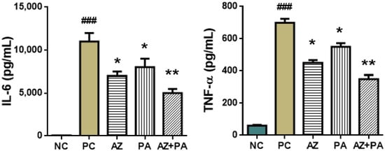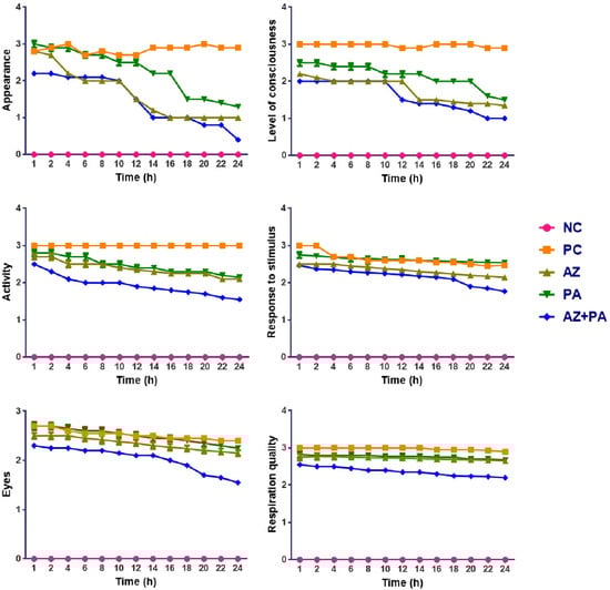 Twenty healthy Swiss albino mice, 10–12 weeks old (both sexes, body weight 22–26 g) were used in this experiment. They were randomly divided into four groups: 1st—LPS-group received no therapy, 2nd—LPS-group received azithromycin, 3rd—LPS group received PA, 4th—LPS group received azithromycin and PA. The sepsis model was induced by an intraperitoneal injection of LPS (1 mg/kg) to mice 1 h before the appropriate therapy [28]. Azithromycin was given to mice at the dose of 25 mg/kg, which was based on its concentration in water (0.625 mg/mL) and the average water consumption and bodyweight of animals [29,30]. The dose of PA was selected to be 62.5 mg/kg in reference to subacute toxicity and pharmacokinetic studies. For the evaluation of prophylactic effect, PA and azithromycin were administered 1 h before the induction of LPS-sepsis. The modified Murine Sepsis Score (MSS) was used to assess the severity of sepsis in mice [31]. Animals were observed and scored (0–3) for the following markers: appearance, level of consciousness, activity, response to stimulus, eyes, and respiratory quality for 24 h. The MSS scoring was performed independently by two blinded investigators for each sepsis component, and recorded at 1, 2, 4, 6, 8, 10, 12, 14, 16, 18, 20, 22, 24 h. Then, the scores of each mouse were used to calculate the mean score for the group. Animals were also weighed before and on Days 3, 7, and 10 after the induction of sepsis. At the end of the experiment, animals were euthanized and peritoneal lavage was obtained for immunological analysis of the levels of IL-6 and TNF-α.