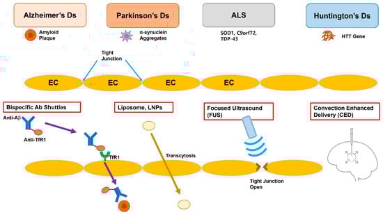 Schematic representation of the blood–brain barrier (BBB) and four clinically relevant strategies for targeted drug delivery to the central nervous system. The top row lists four prevalent neurodegenerative disorders—Alzheimer’s disease (AD), Parkinson’s disease (PD), amyotrophic lateral sclerosis (ALS), and Huntington’s disease (HD)—all of which require therapeutic access to the central nervous system. (1) Bispecific antibody shuttles engage endothelial receptors such as transferrin or IGF-1R and undergo receptor-mediated transcytosis, ferrying otherwise impermeable macromolecular cargo into the brain parenchyma. (2) Liposomes or lipid nanoparticles (LNPs) traverse the BBB via adsorptive or ligand-directed endocytosis/transcytosis. (3) Focused ultrasound (FUS), in conjunction with circulating microbubbles, induces transient and reversible opening of endothelial tight junctions, enabling size-independent passive diffusion of therapeutics. (4) Convection-Enhanced Delivery (CED) utilizes a stereotactically placed micro-catheter to infuse agents directly into the interstitial space, driving bulk flow that distributes the drug over centimeter-scale volumes independent of molecular weight. EC, endothelial cell; TfR, transferrin receptor; Aβ, β-amyloid; SOD1, superoxide dismutase 1; C9orf72, chromosome 9 open reading frame 72; TDP-43, TAR DNA-binding protein 43; HTT, huntingtin.