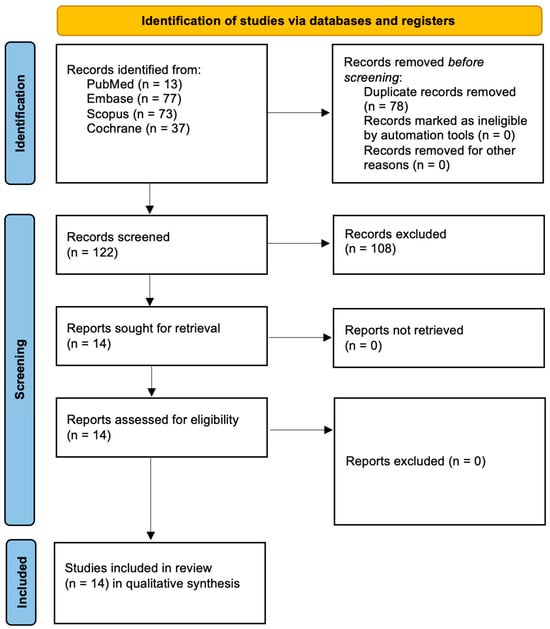 In alignment with the PRISMA 2020 guidelines, the study selection process is illustrated in Figure 1. A total of 200 records were initially identified through database searches, including PubMed (n = 13), Embase (n = 77), Scopus (n = 73), and Cochrane Library (n = 37). After the removal of 78 duplicate records, 122 unique articles remained for title and abstract screening. Of these, 108 records were excluded based on predefined eligibility criteria, leaving 14 full-text reports assessed for eligibility. No reports were excluded or not retrieved at this stage. Ultimately, all 14 studies met the inclusion criteria and were included in the qualitative synthesis. These randomized controlled trials formed the evidence base for evaluating the efficacy of laser and aPDT interventions in the treatment of intraoral halitosis.