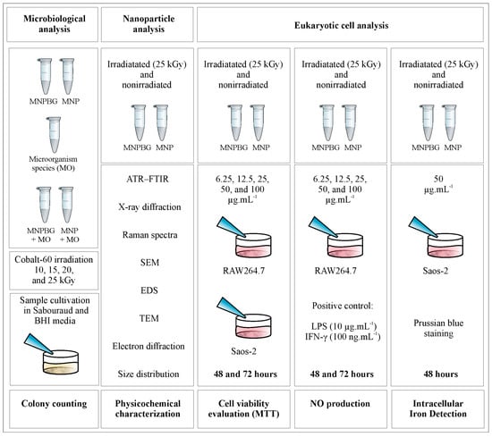 Experimental design for microbiological and eukaryotic cell analyses. Samples of MNP and MNPBG, irradiated or not, were tested for microbial growth (colony counting), physicochemically characterized, and evaluated in RAW264.7 and Saos-2 cells for cell viability (MTT assay), NO production, and intracellular iron detection (Prussian blue staining).