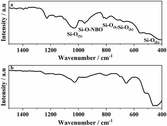 After sterilization with gamma irradiation, significant differences were found in the silicon-oxygen bond vibrations regarding that of vitreous silica. The intensities of the bands associated to the Si-O(s) and NBOs were decreased in the glass (Figure 2b). The bands related to the Si-O(b) bonds, on the other hand, were broadened and shifted to lower wavenumbers. The increase in the intensity can be reflected in the change taking place in the glass structure after interaction with gamma irradiation and shifting of the bands towards a lower wavenumber.