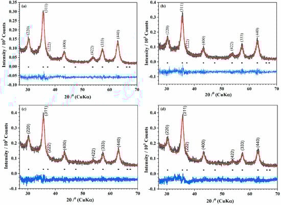 Powder X-ray diffraction patterns (Black) of the samples (a) MNP 0 kGy, (b) MNP 25 kGy, (c) MNPBG 0 kGy, and (d) MNPBG 25 kGy. The solid red lines correspond to the profiles fitted through Rietveld refinement. The solid blue lines correspond to the residual, or the difference between the calculated and experimental diffraction pattern.