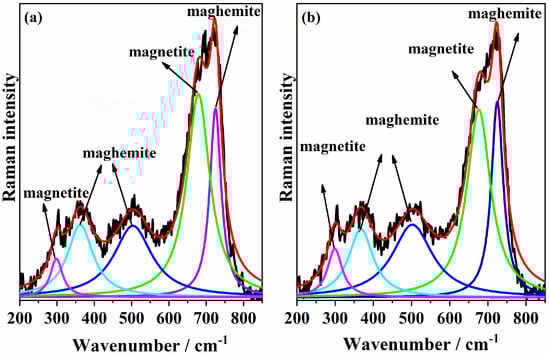The low-frequency region (150–800 cm−1) contains the characteristic Raman bands of iron oxides and is particularly interesting for the analysis of magnetite–maghemite content [47]. The Raman spectra of the samples MNP 0 kGy and MNP 25 kGy (Figure 4a and Figure 4b, respectively) were similar and confirmed the presence of magnetite and maghemite in the samples. The most intense band was decomposed into two Lorentzian components at 671 and 721 cm−1. The main A1g mode of nanophase Fe3O4 was observed at 671 cm−1. The component at 721 cm−1 was assigned to the main band of nanophase γ-Fe2O3. The deconvolution of these two peaks showed that, after the sample irradiation, the peak related to magnetite was slightly more intense than that related to maghemite. This result confirms what was observed in the XRD.