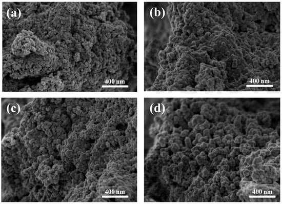 Scanning electron microscopy (SEM) micrographs acquired at 1 kV of (a) MNP 0 kGy, (b) MNP 25 kGy, (c) MNPBG 0 kGy, and (d) MNPBG 25 kGy. Nanoparticles appear as agglomerated clusters, with no major morphological differences among the samples.