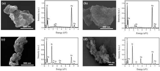 SEM images and corresponding EDS spectra of (a) MNP 0 kGy, (b) MNP 25 kGy, (c) MNPBG 0 kGy, and (d) MNPBG 25 kGy.