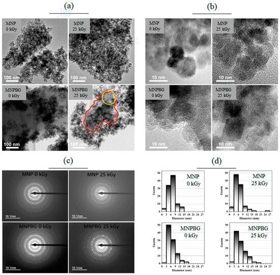 Transmission electron microscopy (TEM) was employed to characterize the microstructure of the magnetic nanoparticles. The results are presented in Figure 7. Bright-field images shown in Figure 7a reveal the shape and size distribution of the analyzed nanoparticles. In these images, the nanoparticles are grouped in clusters, which is commonly observed in superparamagnetic systems because of magnetic dipole–dipole interactions and was also described by Andrade et al. for maghemite-based nanoparticles [22]. While the images of the MNP 0 kGy and MNP 25 kGy samples show only the nanoparticles, bioactive glass can be observed in the images of the MNPBG 0 kGy and MNPBG 25 kGy samples, with emphasis on MNPBG 0 kGy, in which the magnetic nanoparticles appear stacked on a plate-like structure aligned along the diagonal of the image. No relevant morphological differences were observed between irradiated and nonirradiated samples.