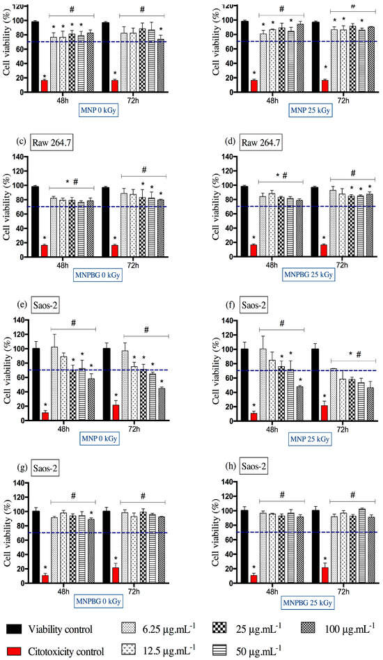 The biocompatibility of MNPBG and MNP was evaluated using a (4,5–dimethylthiazol-2-yl)-2,5–diphenyl-2H-tetrazolium bromide (MTT) assay (Invitrogen®, Waltham, MA, USA), as described in [23]. After cell growth and expansion, a total of 1.5 × 104 cells Saos-2 per well or 5 × 104 Raw 264.7 cells per well were seeded into 48-well plates and cultured for 24 h. Subsequently, Saos-2 and Raw 264.7 cells were treated with either irradiated or nonirradiated MNPBG and MNP suspensions in 1× PBS at concentrations of 6.25, 12.5, 25, 50, and 100 µg·mL−1. The highest concentration (100 µg·mL−1) was included as a stress condition to evaluate the upper safety threshold of the nanoparticles. The viability control group received only 1× PBS, whereas the cytotoxicity control group was exposed to 0.05% (v/v) Triton™ X-100 for 5 min.