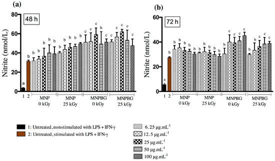 RAW 264.7 cells were seeded at a density of 5 × 104 cells per well and treated with either irradiated or nonirradiated MNPBG and MNP suspensions at concentrations of 6.25, 12.5, 25, 50, and 100 µg·mL−1. Cells were subsequently stimulated with LPS (10 μg.mL−1) or IFN-γ (100 ng·mL−1). Nitric oxide (NO) production, was assessed by measuring nitrite (NO2−) levels using the Griess reaction [24]. NO2− concentrations were calculated based on a standard curve generated with sodium nitrite, and absorbance was measured at 570 nm using a spectrophotometer. All experiments were performed in triplicate.