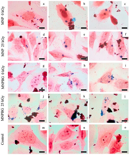 The Prussian blue staining method was used to evaluate intracellular iron levels [25,26]. Saos-2 cells were cultured in McCoy’s 5A medium and seeded onto sterile coverslips placed in 6-well plates at a density of 3 × 105 cells per well. Cells were treated with irradiated (25 kGy) and nonirradiated samples of MNP and MNPBG at a concentration of 50 μg.mL−1 for 48 h. After incubation, the cells were fixed with 4% paraformaldehyde for 30 min and washed twice with 1× PBS. A Prussian blue solution, prepared by mixing equal volumes of 13% hydrochloric acid and 10% potassium ferrocyanide, was added to each well and incubated for 30 min. The presence of ferric iron (Fe3+) was visualized as a blue pigment. Cells were then counterstained with neutral red for 5 min to enhance contrast between cellular structures and iron deposits. Microscopic analysis was performed using an optical microscope (Olympus BX60, Tokyo, Japan) at 1000× magnification.