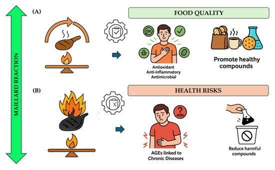 Impact of Maillard Reaction Control on (A) Food Quality (e.g., flavor, color, antioxidant activity) and (B) Health Risk (e.g., formation of AGEs, acrylamide).