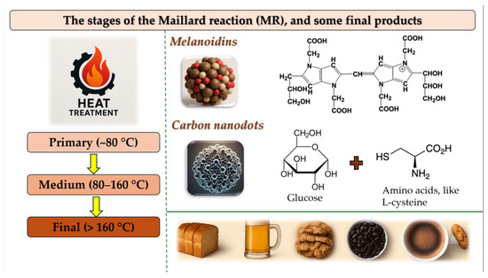 MR is key in developing foods’ color, flavor, and aroma. MRPs can be broadly divided into flavor and color compounds, significantly affecting food’s sensory and chemical properties [6]. In addition, carbon nanoparticles, along with their role in the delivery of bioactive compounds and the digestive system, can also form during this process [32]. Understanding how these compounds are formed, and their roles is essential for improving food processing, product quality, and safety.