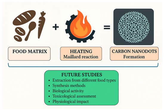 Our findings conclude that future efforts should focus on extracting pure carbon nanodots from heat-treated food products and comprehensively evaluating their biological activity, including toxicity assessment and physiological impact, to assess their potential efficacy fully, as summarized in Figure 4.