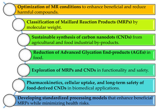 Maillard reaction products (MRPs), influence food color, aroma, taste, antioxidant capacity, and potentially, bioactivity [43]. Due to the diversity of MRPs, it is essential to classify and understand them in terms of molecular weight (MW). Low-molecular-weight MRPs often contribute positively to flavor and aroma, while high-molecular-weight compounds, such as melanoidins, are more associated with color formation and extending complex biological activity [104]. Carbon nanodots formed through the last stages of MR can have low and high molecular weights. Their molecular weight depends mainly on the type of precursors and the reaction conditions, which influence their optical and functional properties. For instance, higher molecular weight nanodots often exhibit more complex structures and broader biological interactions, while lower molecular weight variants tend to have more defined fluorescence features [105]. So, the structure and size of these MRPs determine their roles in food systems [106], thus encouraging researchers to fractionate them and analyze their specific impacts on food safety, functionality, and health.