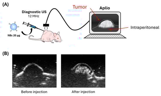 Contrast harmonic imaging following intratumoral NB administration was performed using an Aplio80 US diagnostic system (frequency: 12 MHz; depth: 0.75 cm; mechanical index: 0.27). Samples containing 20 μg NBs were administered intratumorally. (A) Schematic of US imaging using diagnostic US. (B) Contrast images of the tumor.