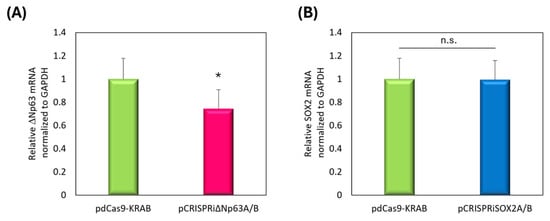 Real-time PCR analysis performed on day 6 following treatment with pCRISPRi, NBs, and US (frequency: 1 MHz; duty cycle: 50%; intensity: 2.0 W/cm2; duration: 2 min). Each sample (20 μg NBs + 10 μg pDNA) was intratumorally administered, followed by US on days 1, 3, and 5. (A) Relative mRNA expression levels of ΔNp63, normalized to GAPDH. (B) Relative mRNA expression levels of SOX2, normalized to GAPDH. Data: mean ± SD (n = 3). * p < 0.05 (Student’s t-test). n.s. indicates not statistically significant.
