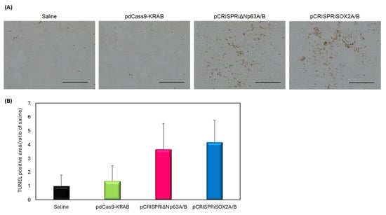 Tumors were treated with pCRISPRi (10 μg in 5 μL TE buffer) and NBs (20 μg, lipid in 60 μL HBS), followed by US (frequency: 1 MHz, duty cycle: 50%; intensity: 2.0 W/cm2, duration: 2 min) on days 1, 3, and 5. Total RNA from the tumors harvested on day 6 was obtained by using RNAiso Plus (Takara Bio, Otsu, Japan). A 1 μg quantity of total RNA was used for reverse transcription. Reverse transcription was performed using ReverTra Ace qPCR RT Master Mix (Toyobo, Osaka, Japan) according to the manufacturer’s instructions. The specific probes for CDKN1A (Hs00355782_m1), ΔNp63 (Hs00978339_m1), SOX2 (Hs01053049_s1), and Glyceraldehyde-3-phosphate dehydrogenase (GAPDH) (Hs03929097_g1) were derived from the commercially available TaqMan Gene Expression Assays (Thermo Fisher Scientific Inc., Waltham, MA, USA). The real-time PCR reactions were performed using TaqMan Fast Advanced Master Mix for qPCR (Thermo Fisher Scientific Inc.) and a real-time RT-PCR system (CFX96; Bio-Rad Laboratories, Inc., Hercules, CA, USA). The number of cycles for the amplification plot to reach the threshold limit (Ct value) was used for quantification. GAPDH was used as endogenous control.