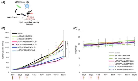 Local pCRISPRi delivery using NBs and US (frequency: 1 MHz; duty cycle: 50%; intensity: 2.0 W/cm2; duration: 2 min) thrice every other day. Each tumor received 20 μg NBs and 10 μg pDNA via intratumoral injection. Red arrows indicate the administration day. (A) Treatment schematic. (B) Tumor volume measured bi-daily until day 15. (C) Mouse body weight changes. Data: mean ± SD (n = 5). * p < 0.05 (one-way ANOVA, Tukey’s post hoc test).
