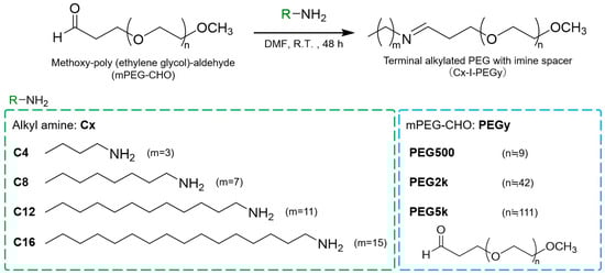 α-methoxy-ω-(3-oxopropoxy) and polyoxyethylene (mPEG-CHO) with molecular weights of 550 and 2000 Da were purchased from Creative PEGWorks (Research Triangle Park, NC, USA). α-methoxy-ω-(3-oxopropoxy) and polyoxyethylene (mPEG-CHO) with molecular weights of 5000 Da was purchased from NOF CORPORATION (Tokyo, Japan). n-Octylamine, n-dodecylamine, and n-hexadecylamine were purchased from Tokyo Chemical Industry Co., Ltd. (Tokyo, Japan). n-Butylamine, molecular sieves 3 A 1/8 (MS), and chloroform were purchased from FUJIFILM Wako Pure Chemical Corporation (Osaka, Japan). N,N-dimethylformamide (DMF), and hexane were purchased from Kanto Chemical Co., Inc. (Tokyo, Japan). All other chemicals of a special grade were used without further purification.