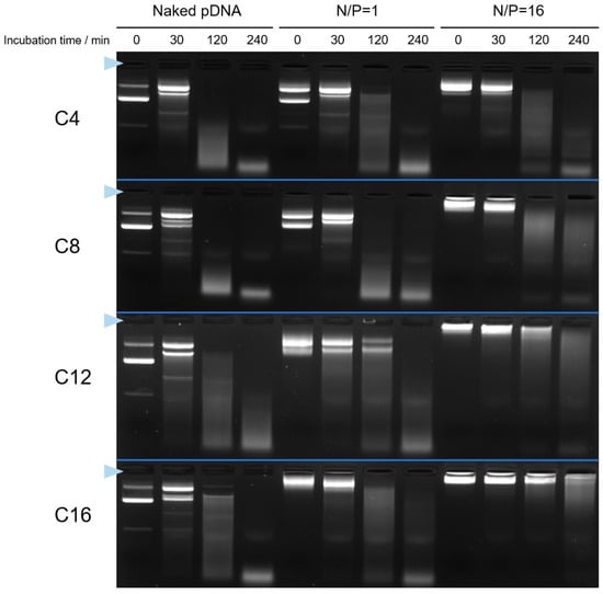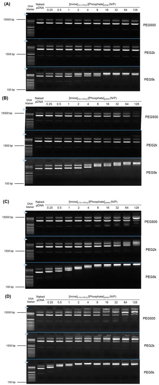 Complex formation between Cx-I-PEGy and pDNA as assessed by agarose gel electrophoresis. pDNA complex formation by (A) C4-I-PEGy, (B) C8-I-PEGy, (C) C12-I-PEGy, and (D) C16-I-PEGy, respectively. The mixing ratios of the imine of Cx-I-PEGy to phosphate group of pDNA, [Imine]Cx-I-PEGy/[Phosphate]pDNA (N/P), are indicated. The blue triangle indicates the well where each sample was loaded.