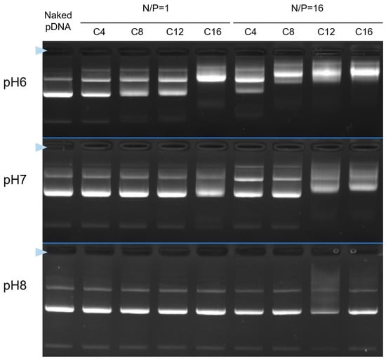 Formation of Cx-I-PEG5k/pDNA I-MICs under difference of pH as assessed by agarose gel electrophoresis. The complexes at mixing ratios (N/P) of 1 and 16 were incubated in phosphate buffer (PB) at pH 6, 7, and 8, respectively, and were electrophoresed in the same buffer at pH 6, 7, and 8. The blue triangle indicates the well where each sample was loaded.