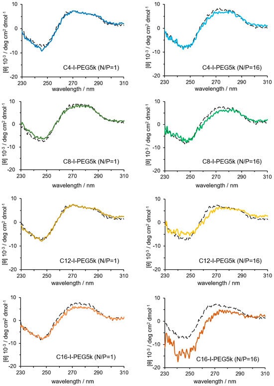 CD spectrum of the I-MICs between the pDNA and Cx-I-PEG5k at mixing ratios (N/P) of 1 and 16. The mixing charge ratios (N/P) of 1 and 16. The CD spectrum of the naked pDNA is represented as a black dotted line in each panel.