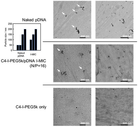 Representative TEM images of C4-I-PEG5k/pDNA I-MIC. The mixing ratio (N/P) was 16. Each left image is an enlargement of each right image. (Inset) Histogram of the size distribution indicated by arrows.