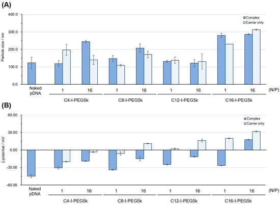 Particle size and zeta (ζ) potential of the Cx-I-PEG5k/pDNA I-MICs: (A) particle size and (B) ζ-potential. The mixing ratios (N/P) are 1 and 16. The dark blue bars indicate complex values, and the light blue bars indicate carrier only values. The error bars represent the mean and standard deviation of the measurements (particle size: n = 5, ζ-potential: n = 3).