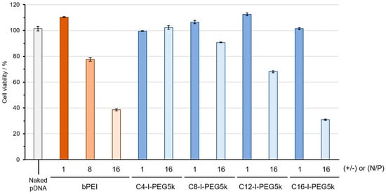 The biochemical properties of the Cx-I-PEG5k/pDNA I-MICs in vitro were evaluated. The cytotoxicity of the Cx-I-PEG5k/pDNA I-MICs was assessed. Since bPEI is considered the gold standard as a pDNA delivery carrier in vitro [29,30], it was used as a control in the cytotoxicity assay. The bPEI is a polycation from a PIC with higher cytotoxic cation density than linear PEI, and lipofectamine is a lipid assembly, so we used bPEI as a positive control to compare I-MICs with a representative PIC. The cells used were C2C12 mouse myoblasts derived from muscle satellite cells. As shown in Figure 9, cell viability decreased with longer alkyl chains in the Cx-I-PEG5k/pDNA I-MICs at the mixing N/P ratio of 16. At the mixing N/P ratio of 1, on the other hand, cell viability did not decrease, even in case of C16-I-PEG5k with the longest alkyl chain. We did not further analyze the trend of cell viability with the increase of alkyl chain length at the mixing N/P ratio of 1, because the C16-I-PEG5k/pDNA I-MIC exhibited the apparent different (large) particle size as compared to other I-MICs (Figure 7A). The hydrophobic and hydrophilic portions of Cx-I-PEG5k as our pDNA delivery carrier exhibited a surfactant effect, suggesting that they easily disrupted the cell membrane and caused cytotoxicity. The intrinsic cytotoxicity of 1 mM Cx-I-PEG5k is estimated from hemolytic assay at pH 7 (Figure S9). The longer the alkyl chain of the Cx-I-PEG5 k, the higher the hemolytic activity at pH 7 (Figure S9). The resulting hemolytic activity induced by the Cx-I-PEG5k with longer alkyl chains supports the results of the cytotoxicity assay (Figure 9). Especially, the cell viability at the mixing N/P ratio of 16 for C16-I-PEG5k was approximately 30%, lower than bPEI, therefore suggesting that the surfactant effect stood out from the PEG shielding effect.