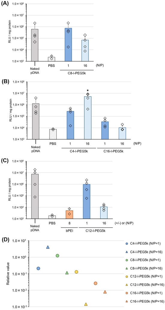 In vivo gene transfection efficiency in mouse skeletal muscles. Luciferase gene expression by intramuscular injection of pDNA complex with (A) C8-I-PEG5k, (B) C4-I-PEG5k and C16-I-PEG5k, and (C) C12-I-PEG5k and bPEI. The mixing ratios (N/P) are 1 and 16. Individual gene expression was determined via relative light unit (RLU) normalized by the protein concentration. Rhombic plots were indicated as an individual value. p-values are * p < 0.1 vs. naked pDNA. All data are represented as the mean and individual values (n = 2–4). (D) Gene expression of each complex was relative to gene expression of naked pDNA for each experiment. The circular plots indicate the value at the mixing ratio (N/P) of 1, and the triangular plots indicate the value at the mixing ratio (N/P) of 16.