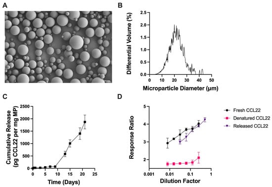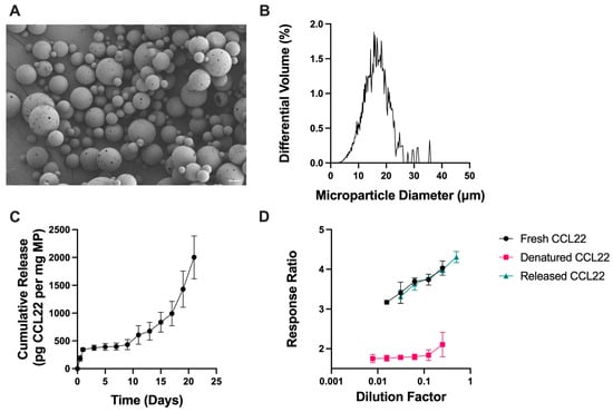 Characterization of double emulsion CCL22 microparticles. (A) Representative SEM image demonstrating the porous, spherical particles. (B) Size distribution as determined by volume impedance measurements (mean diameter 17.4 ± 7.0 μm). (C) Release kinetics of CCL22 over a 21-day period, as determined via in vitro release assay and ELISA. Data are mean ± SEM (n = 3). (D) Biological activity of released CCL22 compared to fresh and denatured CCL22 measured using a cell-based assay. Higher response ratio corresponds to greater bioactivity. Results are mean ± SD (n = 3).