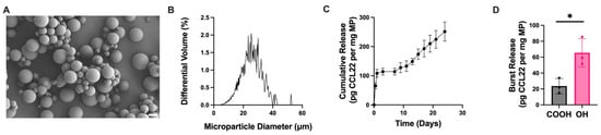 Altering initial burst release through changing polymer endcap. (A) Representative SEM image of CCL22-MPs manufactured via SE method with hydroxyl-terminated PLGA, demonstrating smooth spherical particles. (B) Size distribution as determined via volume impedance measurements (mean diameter: 22.5 ± 7.3 μm). (C) Release kinetics of CCL22 over a 21-day period as determined by in vitro release assay and ELISA. Data are mean ± SEM (n = 3). (D) Comparison of initial burst release between CCL22-MPs manufactured with PLGA-COOH vs. PLGA-OH. Results are mean ± SD (n = 3). A significant difference was identified by a two-tailed independent t-test. * p < 0.05.