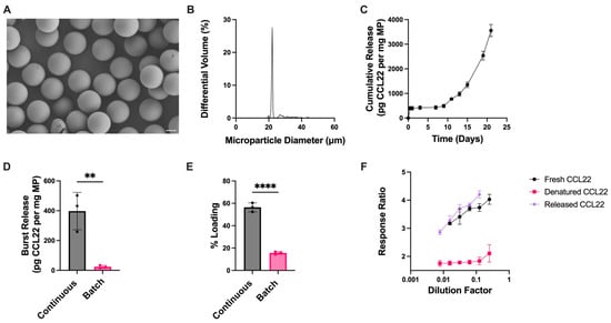Microfluidic manufacturing of CCL22 microparticles. (A) Representative SEM image demonstrating monodispersed particles with smooth morphology. (B) Size distribution as determined via volume impedance measurements (mean diameter: 23.3 ± 4.1 μm). (C) Release kinetics of CCL22 over a 21-day period as determined by in vitro release assay and ELISA. Data are mean ± SEM (n = 3). (D) Burst release comparison between CCL22-MPs manufactured via microfluidic (continuous) and homogenization (batch) methods. (E) Comparison of protein loading between CCL22-MPs manufactured via microfluidic (continuous) and homogenization (batch) methods. Release and loading characterization results in C-E are presented as mean ± SD (n = 3). Significant differences in D–E were determined by a two-tailed independent t-test. ** p < 0.01, **** p < 0.0001. (F) Biological activity of released CCL22 compared to fresh (unencapsulated) and heat-denatured CCL22, measured via a cell-based assay. Results are mean ± SD (n = 3).
