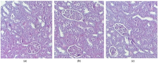 The histological kidney structure in mice belonging to the following groups: Control (a), IND (b), IND-ves (c). Masson trichrome stain ×20, scale bar = 100 µm.