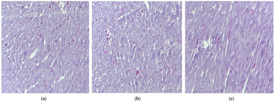 The histological myocardium structure in mice belonging to the following groups: Control (a), IND (b), IND-ves (c). Masson trichrome stain ×20, scale bar = 100 µm.