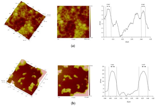 Morphological characterization of unloaded and extract-loaded BSA NPs (5 mg) was performed using atomic force microscopy (AFM). Samples were diluted in a 1:4 ratio with a blank solution (20% ultrapure water–80% absolute ethanol), and 40 μL was added onto a mica surface. The samples were left to dry at room temperature for approximately 4 h. The analysis was conducted using a Multimode 8 HR instrument coupled to a Nanoscope V Controller (Bruker, Coventry, UK), operating with a scan rate of 1 Hertz, under peak force tapping mode with ScanAssist. Images were obtained using the ScanAsyst-air (0.4 N/m) (Bruker, Coventry, UK) tip model and processed with NanoScope V 1.8 software.