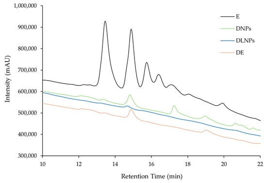 Chromatogram of the free extract (E), digested extract (DE), digested lyophilized NPs (DLNPs), and digested non-lyophilized NPs (DNPs), obtained by means of HPLC-DAD (10–22 min).