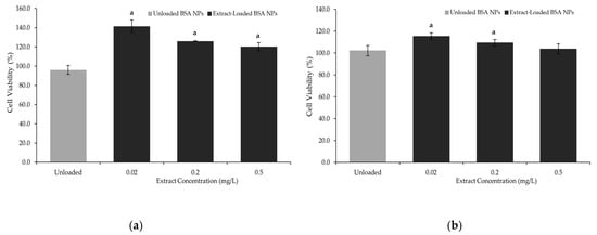 Cell viability (%) in (a) Caco-2 and (b) HepG2, after 24 h exposure to unloaded and extract-loaded BSA NPs at various concentrations, where “a” corresponds to samples that are statistically different from the unloaded BSA NPs, according to a one-way ANOVA (p ≤ 0.05).
