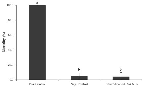 A. salina mortality (%) after 24 h of being incubated with the extract-loaded BSA NPs (0.240 mg/mL). The positive and negative controls were 100% DMSO and Artemia salt medium, respectively. Where “a” corresponds to samples that are statistically different from the negative control and “b” corresponds to samples that are statistically different from the positive control, according to a one-way ANOVA (p ≤ 0.05).