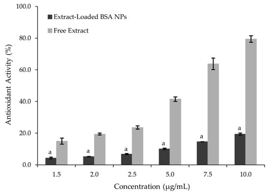Antioxidant activity (AA) (%) of the free extract and extract-loaded BSA NPs for different concentrations. At each concentration, bars labeled with “a” are statistically different from the free extract, according to a one-way ANOVA (p ≤ 0.05).