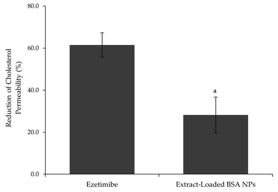 Reduction in cholesterol permeability (%) for ezetimibe (0.01 mM) and extract-loaded BSA NPs (0.240 mg/mL), where “a” corresponds to the sample that is statistically different from the ezetimibe, according to a one-way ANOVA (p ≤ 0.05).