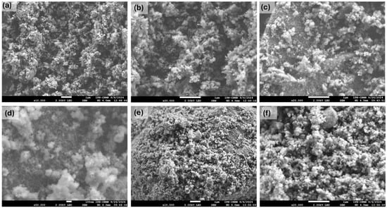 SEM images of the various TiO2 samples at different magnifications are shown in Figure 1. The TiO2 sample displays a morphology composed of agglomerates of small particles ranging from approximately 10 to 100 nm (Figure 1a,b), forming a porous TiO2 network. Similarly, the TiO2-FA sample exhibits a morphology of aggregated particles (Figure 1c,d), and the TiO2-FA-ZnPc sample shows the same structural characteristics (Figure 1e,f). In all cases, the nanoparticle aggregates result in a porous morphology, typical of TiO2 materials synthesized by the sol–gel method.