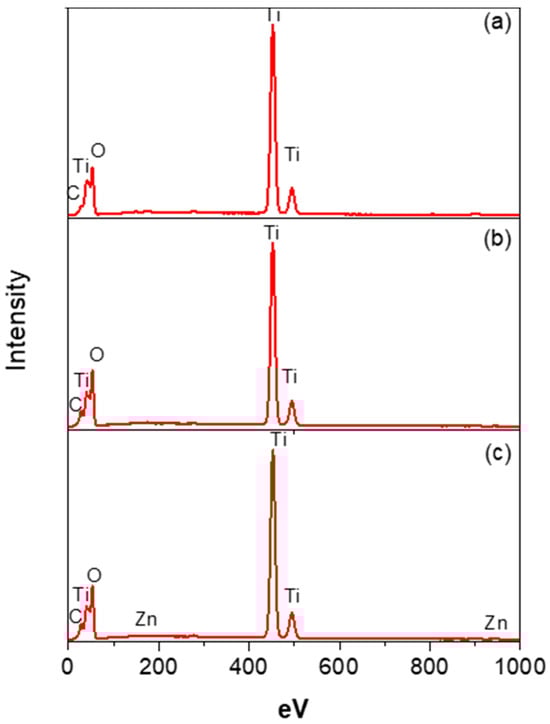 Figure 2 presents the energy-dispersive X-ray spectroscopy (EDS) spectra of the TiO2, TiO2-FA, and TiO2-FA-ZnPc samples. The EDS spectrum of the TiO2 sample indicates titanium as the primary element, along with smaller signals for oxygen and carbon. Titanium and oxygen are part of the TiO2 network, while the carbon likely originates from the alkoxide precursor used in the synthesis (Figure 2a). The TiO2-FA spectrum is similar, showing Ti, O, and a stronger C signal, the latter attributed both to the alkoxide precursor and to folic acid (Figure 2b). The TiO2-FA-ZnPc spectrum displays peaks for carbon, oxygen, and titanium, along with a small zinc signal (Figure 2c), indicating the presence of Zn from the ZnPc component. However, Ti, O, and C remain the dominant elements in all samples.